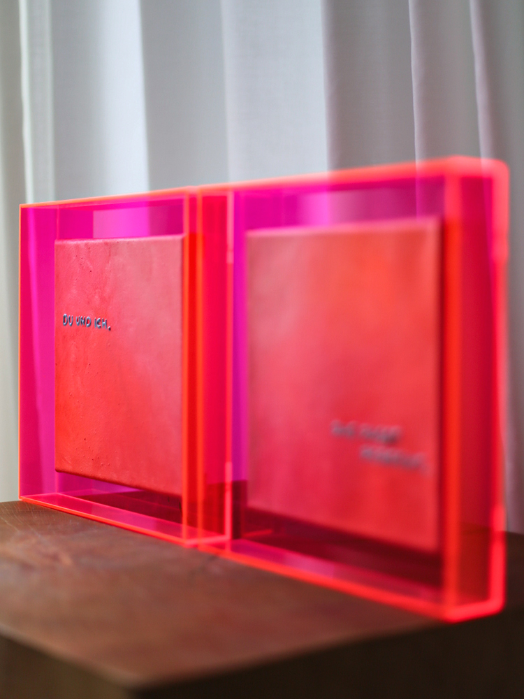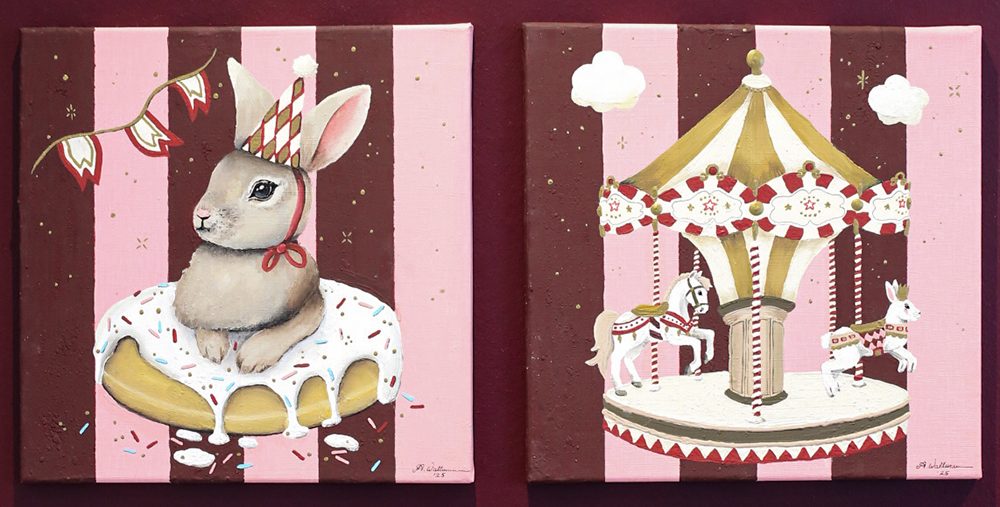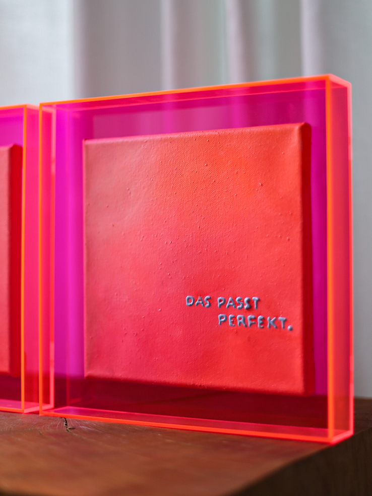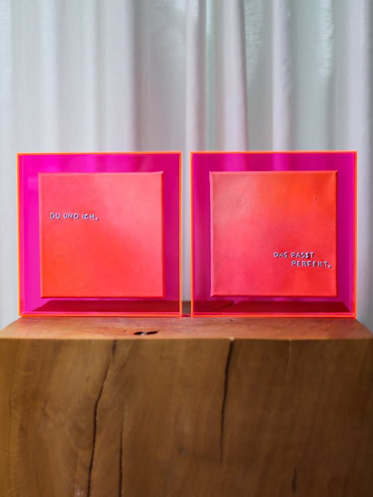 Je zwei mal zwei Werke sind in die Galerie eingezogen. „ICH UND DU. DAS PASST PERFEKT.“ Farbige Statementbilder mit auffallend leuchtendem Acrylrahmen. Außerdem zwei magische Werke mit den Titeln „PARTYRABBIT“ und „MAGICAL MERRY-GO-ROUND“. (Rahmen sind aktuell in Arbeit)