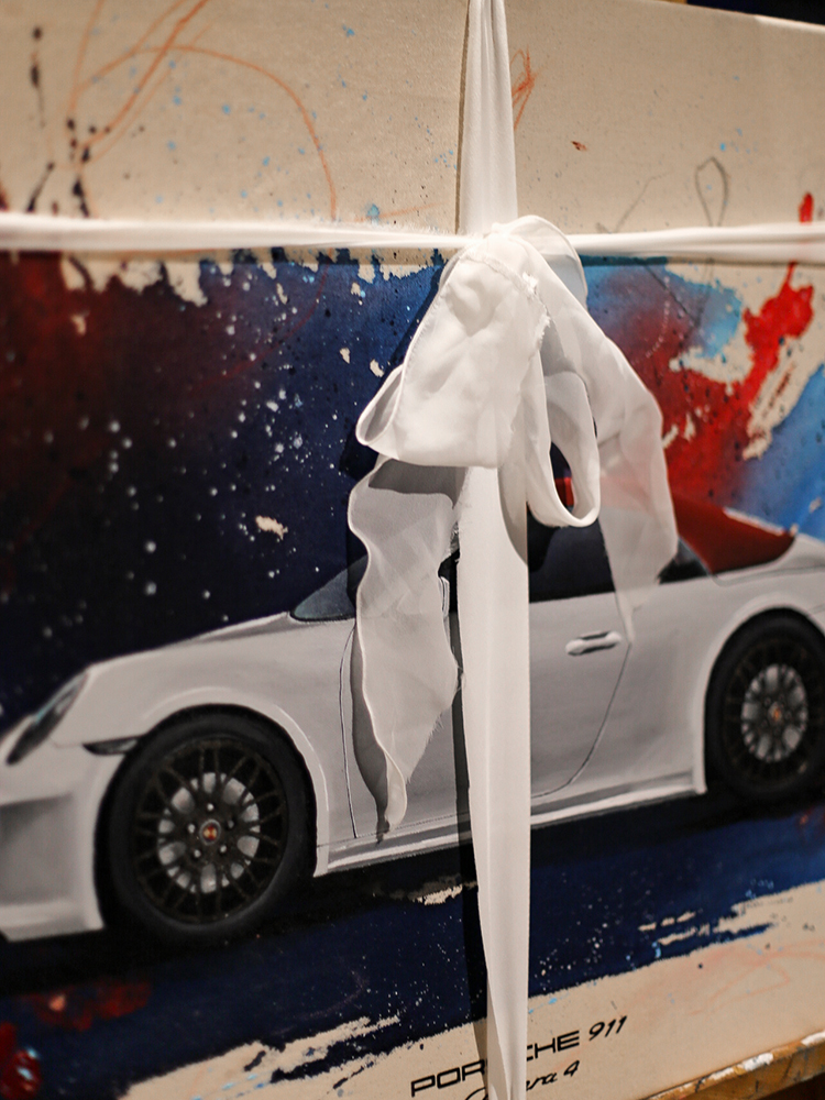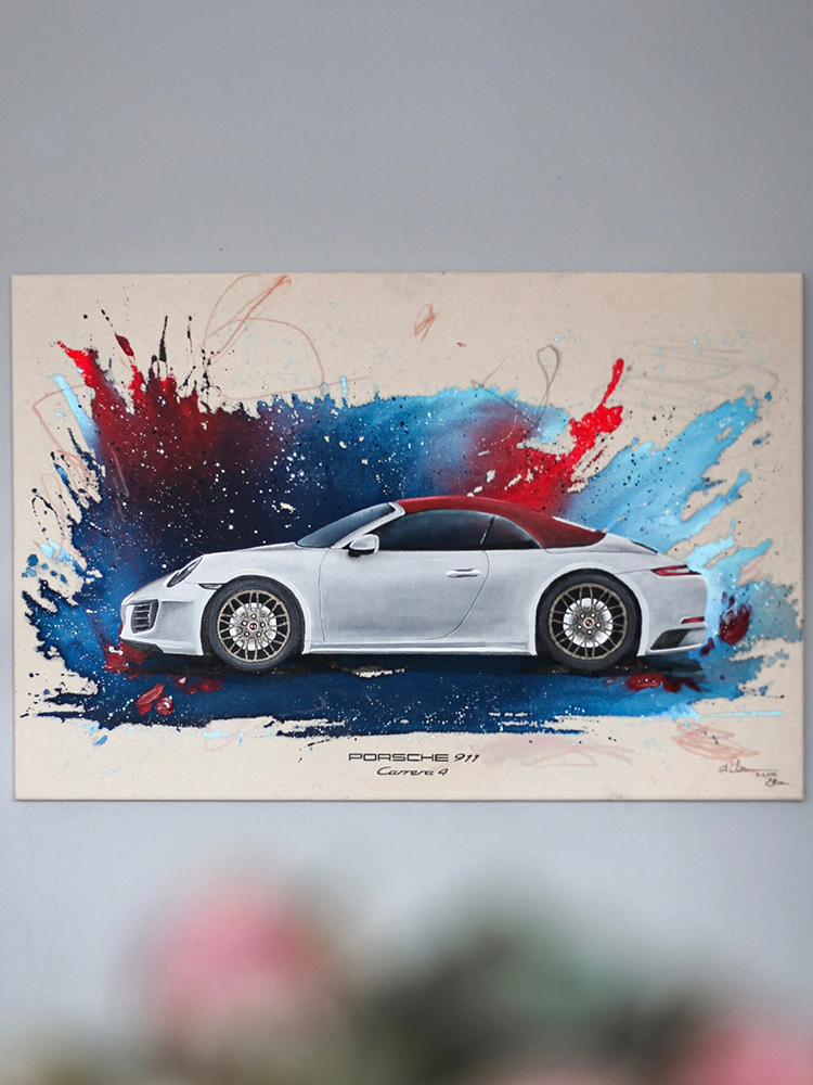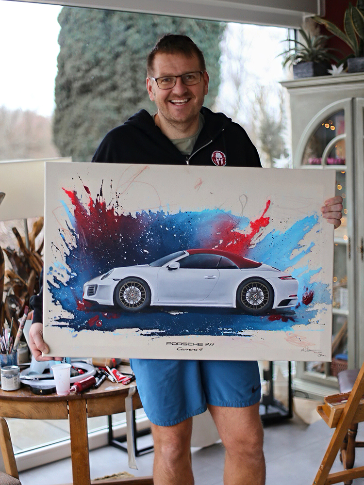 Gleich zu Beginn des Jahres habe ich ein Werk fertiggestellt ‚PORSCHE 911 Carrera 4‘. Dieses Werk (auf 60 x 90 cm) beinhaltet mehr als die Darstellung eines Fahrzeugs. Mit ihm werden sehr viele Emotionen verbunden und aus diesem Grund habe ich das Bild auch mit unserer Tochter zusammen ‚gemalt‘, beziehungsweise durfte sie sich mit abstrakten Kritzeleien darauf verewigen. Ich hatte dieses Bild schon Monate lang im Kopf – ich wusste – wie ich es malen würde, welche Farben, wie unsere Tochter sich mit einbringen kann und wie die Art der Darstellung letztendlich sein sollte. Das Geburtstagsgeschenk war eine gelungene Überraschung und es brauchte nicht mehr als DIESES Geschenk.